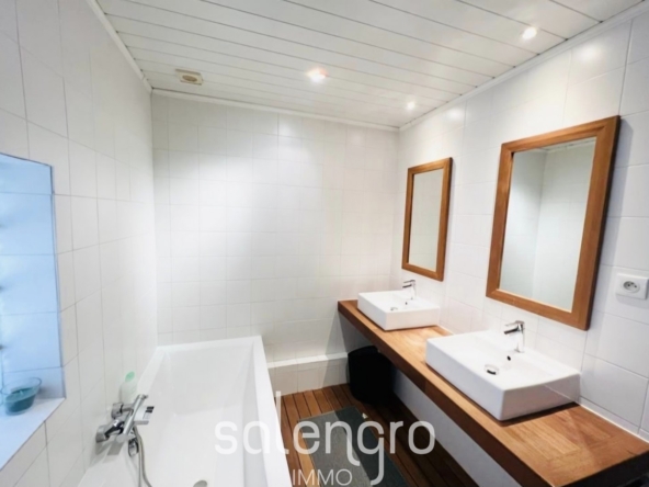 Le coin nuit se compose de deux chambres, l’une de 10m² et l’autre de 16m² avec de grands placards muraux. Une salle de bain avec double vasque et emplacement pour machine à laver. WC séparé suspendu.