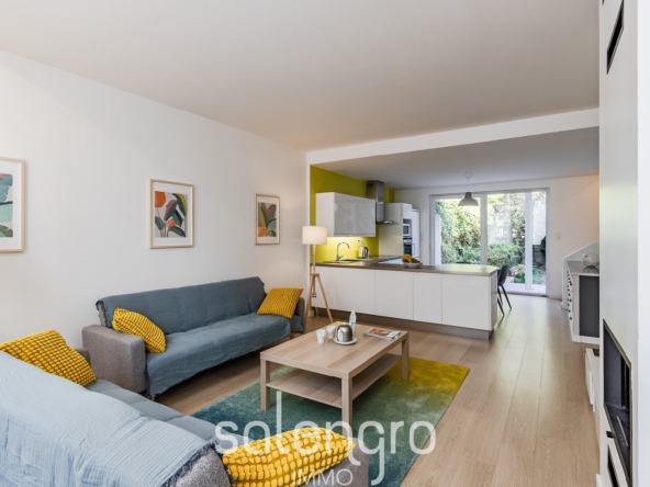 Cette maison est entièrement équipée avec une grande pièce de vie de 35m² (avec canapé et TV) cuisine ouverte (avec four, plaque de cuisson, hotte, frigo, lave vaisselle, grande table) et donnant accès à un grand jardin privatif de 125m². Au premier étage, 2 chambres avec lit, bureau et grand placard de rangement chacune. Egalement à cet étage, deux salles d’eau et une salle de sport équipée.