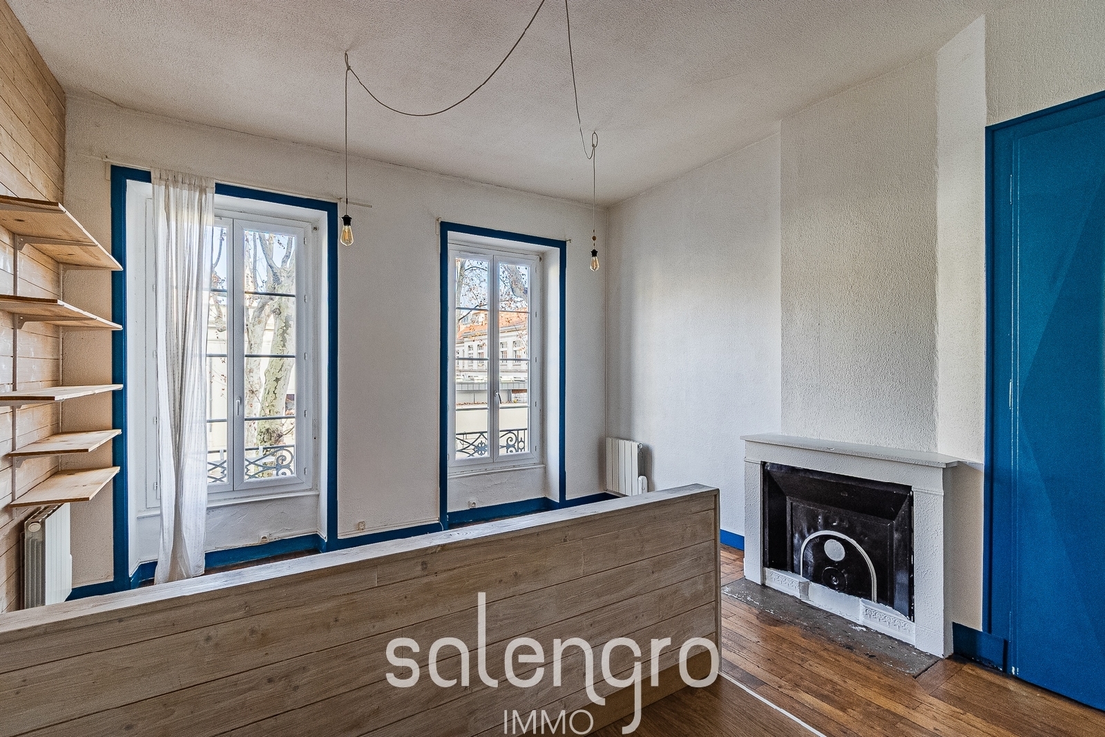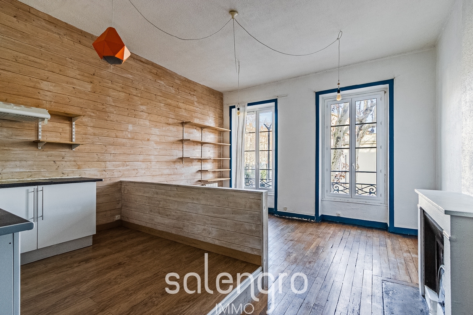 T2 traversant avec agréable pièce de vie de 25m² parquet chêne, cheminée, belle hauteur sous plafond. Côté cuisine, elle est entièrement meublée et est positionnée sur une estrade qui permet de créer un espace séparé et agréable.